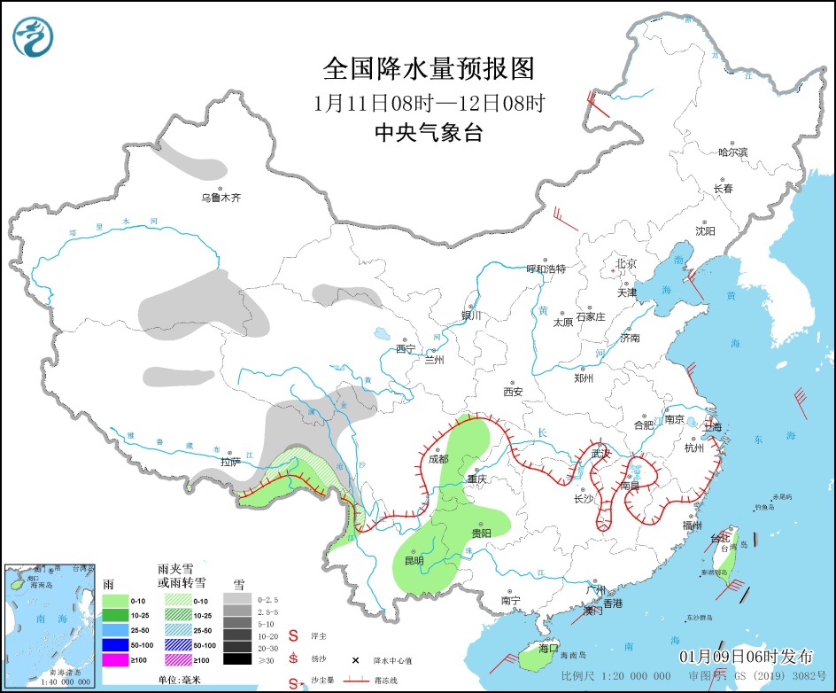 1月11日08时至12日08时,西藏东部等地部分地区有小到中雪。四川盆地中东部、贵州中西部、云南东部、海南岛大部、台湾岛东部和南部等地部分地区有小雨。内蒙古东北部和中部等地部分地区有4~5级风(见图3)。