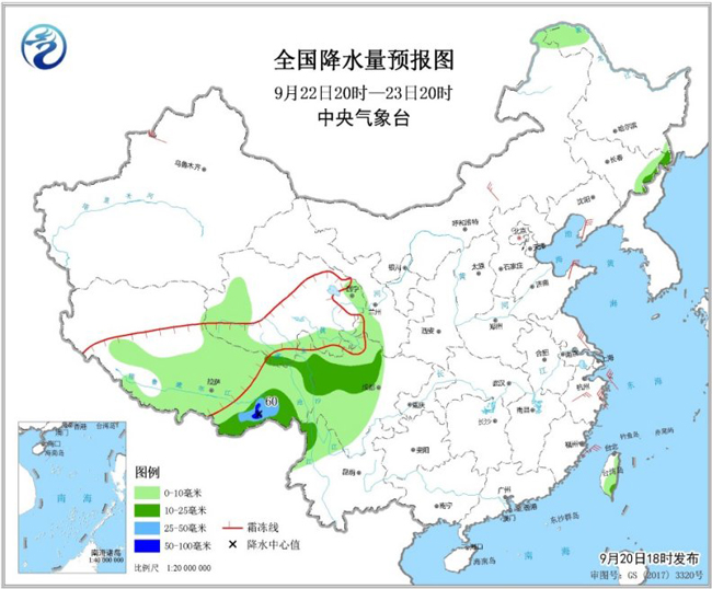 图4 全国降水量预报图(9月22日20时-23日20时)