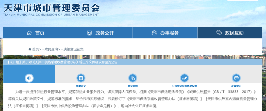 为进一步提升供热行业管理水平,规范供热企业服务行为,切实保障人民权益,近日,天津市城市管理委员会根据《天津市供热用热条例》《城镇供热服务(GB/T 33833-2017)》等有关法规和政策文件、规范标准的要求,结合我市实际情况,修订了《天津市供热采暖收费管理办法(征求意见稿)》《天津市供热室内温度测量管理办法(征求意见稿)》《天津市集中供热设施管理办法(征求意见稿)》,现向社会公开征求意见。