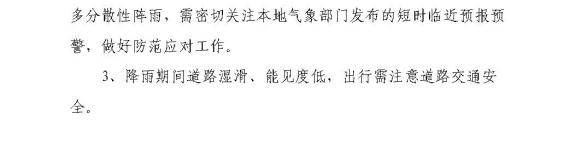 2、关注强对流天气影响。过程期间伴有短时暴雨、雷暴大风等强对流天气,政府及相关部门按照职责做好防雷、防风工作;高空、水上、田间等户外作业人员遇到强对流天气应立即停止作业;户外行人注意远离棚架广告牌等搭建物,尽量躲入有防雷设施的建筑物或者汽车内,避免雷雨时在大树、高耸孤立物下避雨、接打手机。