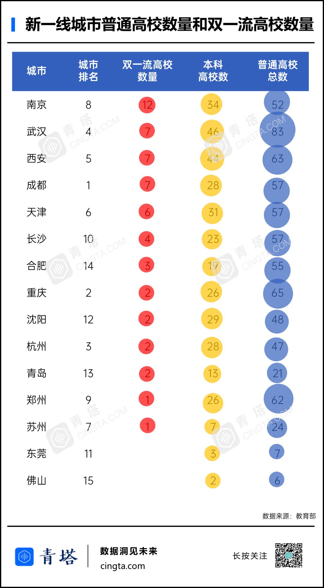 双一流高校数量,则更能体现一座城市顶尖高教资源的多寡。