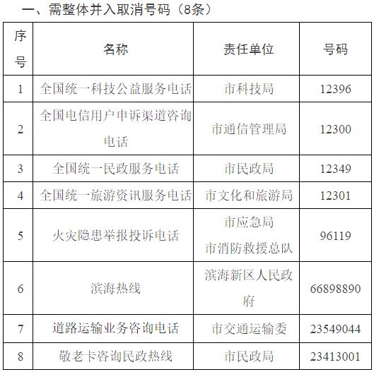 8条热线取消号码,将话务座席统一归并到12345热线,包括国务院有关部委设立并在本市接听的12396等5条热线和本市有关区、部门设立的66898890等3条热线。(责任单位:市政务服务办等市级有关部门,滨海新区人民政府;完成时限:2021年9月底)