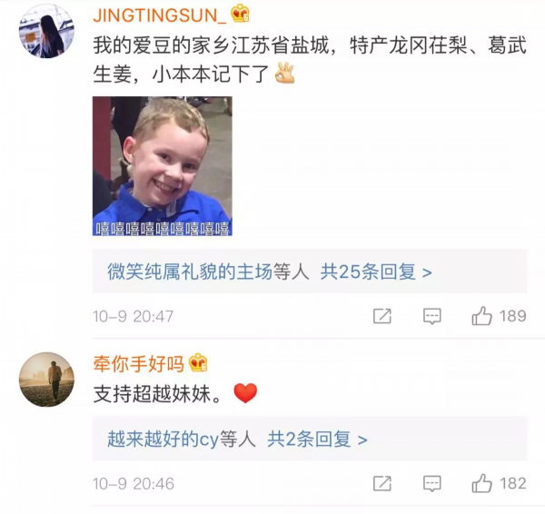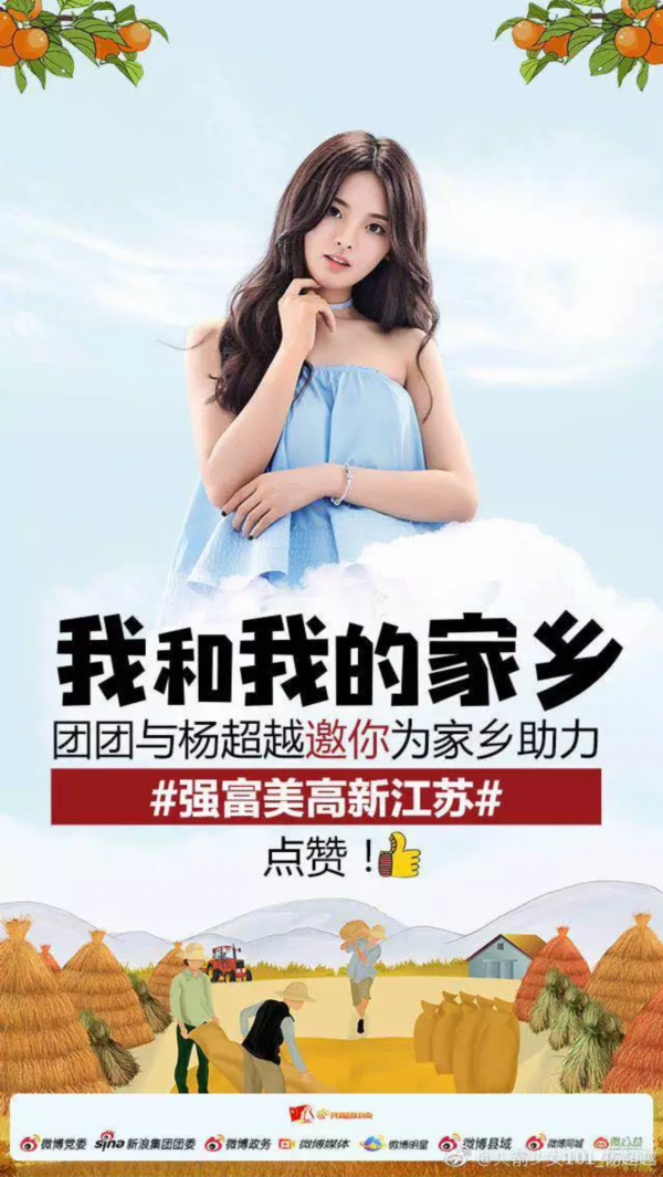 昨晚,“全村的希望”杨超越加入了团中央和新浪微博共同发起的#我和我的家乡# 话题 ,在微博上点赞了盐城的特产助力扶贫攻坚,给盐城乡亲们的腰包吹口气。