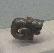 南北朝时期的玉龙,龙身细长,一般刻有细麟纹;头部呈方形,棍棒形长龙角,叶形耳;小腿细长,琢勾一二条阴刻线,突出表现龙的筋骨;龙爪宽厚,龙指尖利;龙尾呈虎尾形;龙眼往往运用重叠的阴刻线纹表现。