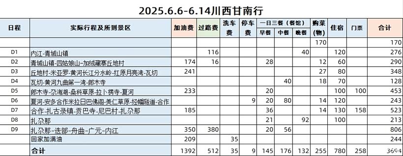 这次2人出行9天,行驶了2200多公里,合计费用3694元。其中: