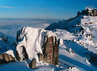 The view of unfurling Jade plate of sea of clouds surrounding the summits is another one gorgeous wonder on top of Mount Tai. In summer, when sun comes out just after the rain, mass vapor vaporized to the sky, and the warm air from sea is lofty above about 1500 meters high and there is no wind, looking from the summit of Mount Tai, you could see white clouds tiling to thousands square meters as white jade plate suspending between earth and heaven. All forane hills are engulfed in the clouds and only few of them emerged; visible tourists like to step on the cloud as if they came to heaven. While breeze blowing, the cloud waved like sea water and the hills conceal and emerge as mysterious fairy islands; while the wind becomes strong, clusters of clouds turn into gigantic dragon flying up and down and thus agitate the sea of cloud.