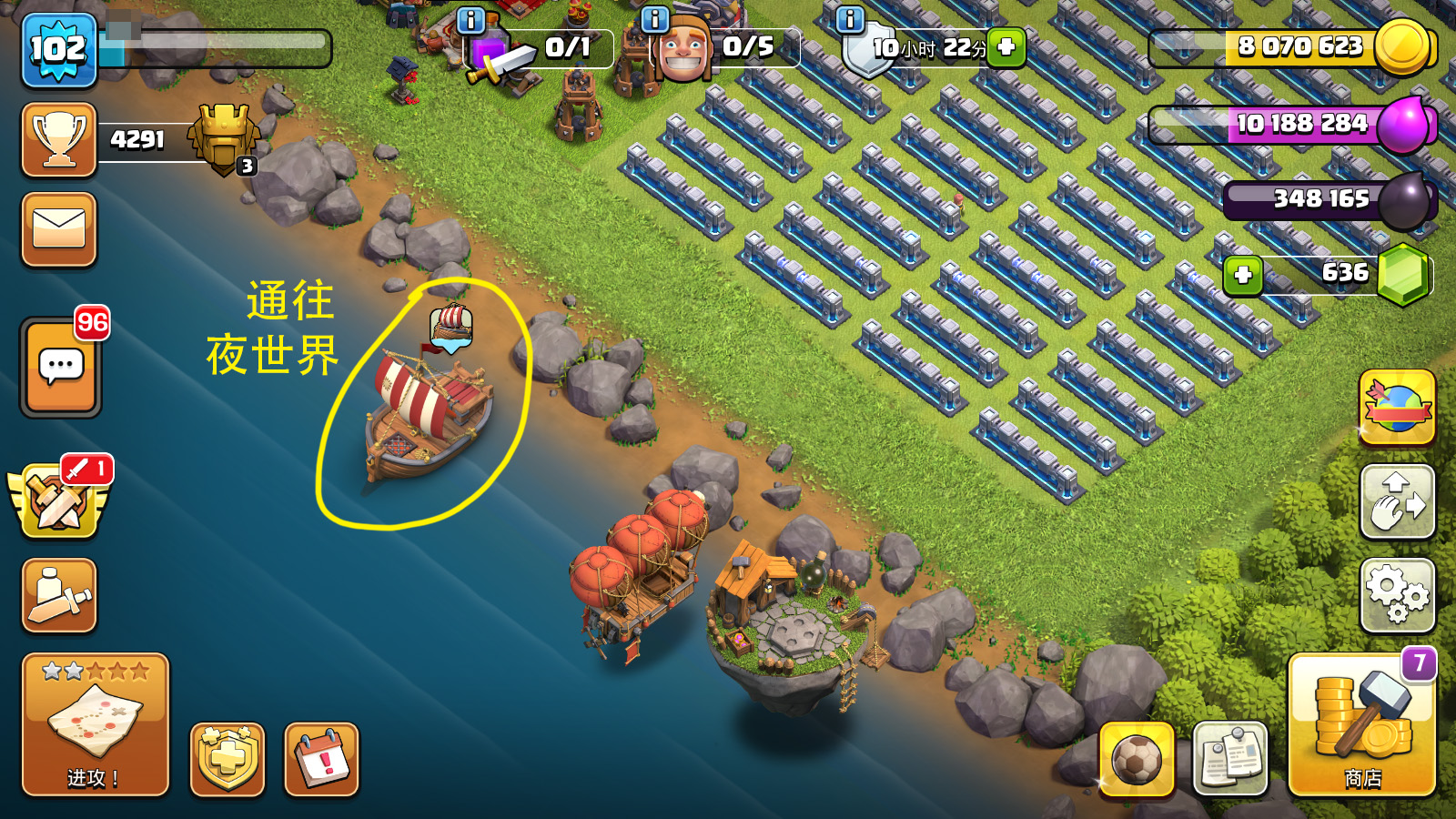 二、夜世界的资源当你的大本营升到 4 级以后,你会在村庄左下角看到一艘船,这艘船就是通往夜世界的媒介。夜世界没有家乡那么重要,但是你需要通过夜世界来获取 第 6 个工人(宝石只能解锁 5 个),所以只要你还想要第 6 个工人,夜世界就不能完全不玩。