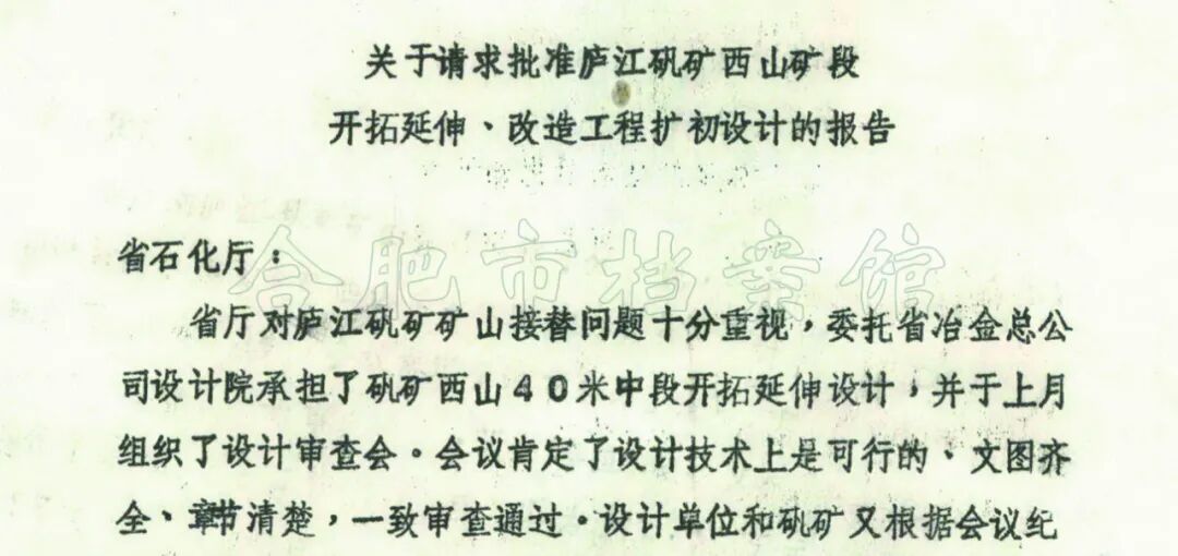会议肯定了设计技术上是可行的、文图齐全、章节清楚,一致审查通过。”合肥市档案馆馆藏档案《关于请求批准庐江矾矿西山矿段开拓延伸、改造工程扩初设计的报告》(1983年)中记载的内容,更成为矾矿发展的有力佐证。