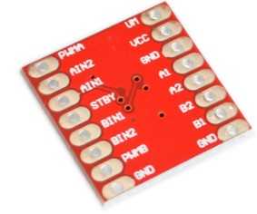 Power supply voltage: VM=15V max, VCC=2.7-5.5V Output current: Iout=1.2A(average) / 3.2A (peak) Standby control to save power CW/CCW/short brake/stop motor control modes Built-in thermal shutdown circuit and low voltage detecting circuit All pins of the TB6612FNG broken out to 0.1″ spaced pins Filtering capacitors on both supply lines
