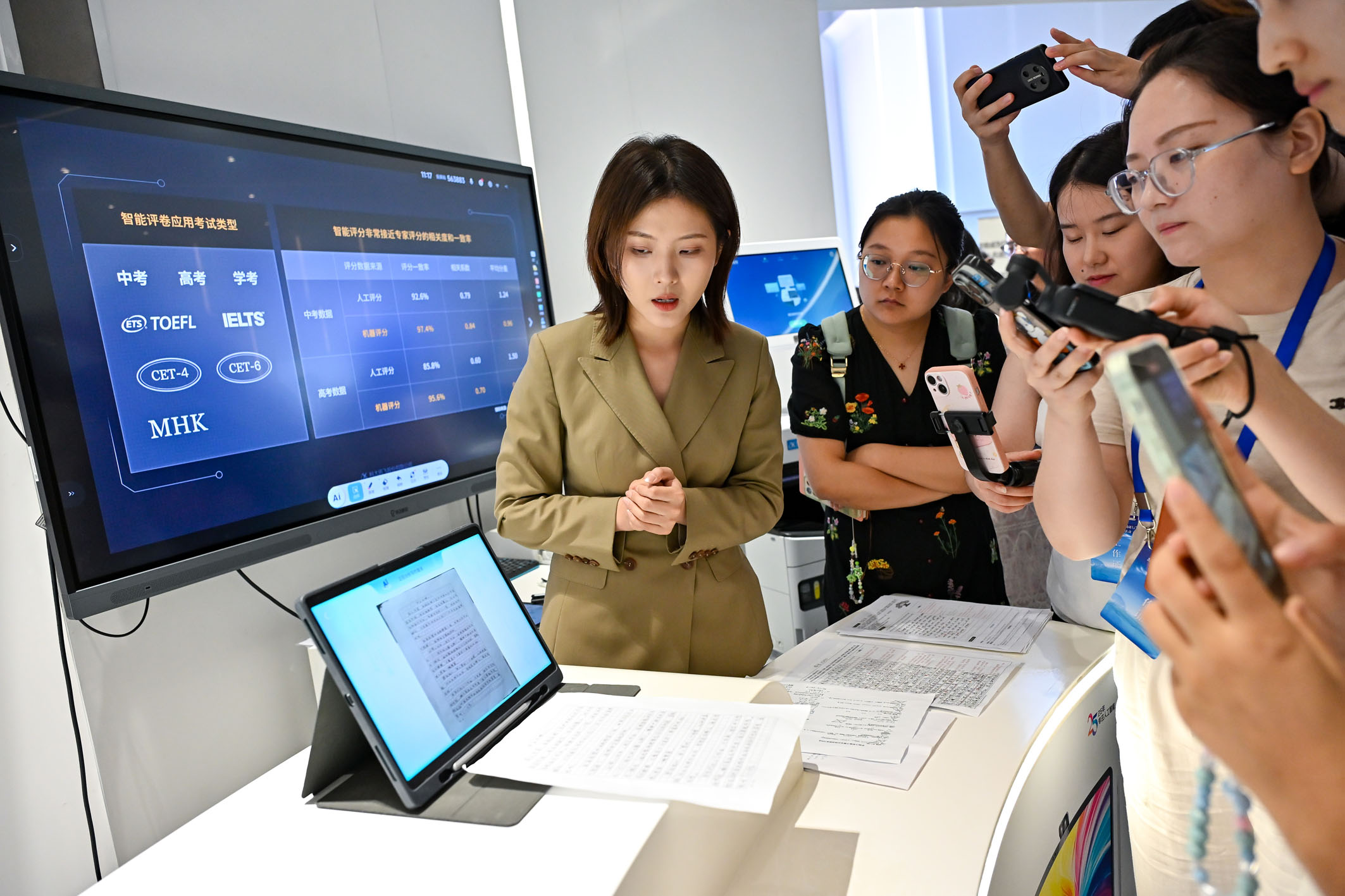 一名工作人员在科大讯飞人工智能体验馆介绍AI学习机的批改作业功能。新华社记者 张铖 摄