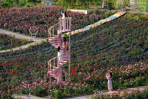 百万玫瑰·梦幻花海是一个集观光、游乐、休闲等为一体的大型综合观光游乐园。依据地形地势,划分为文艺广场、综合游乐场、花海迷宫、花卉观赏区及水上游乐场等功能区。景区内规划种植五大类观赏花卉,共计560多个品种,设有玫瑰观赏区、绣球观赏区、三角梅观赏区、紫荆和各种草本花卉观赏区等。围绕做特做精玫瑰景观,栽种超多种玫瑰花,花型美观、种类多样、配色丰富,极具观赏价值。观光园依据地形地势,将园区划分为文艺广场、综合游乐场、花海迷宫、花卉观赏区、恐龙游乐园及水上游乐场等功能分区。