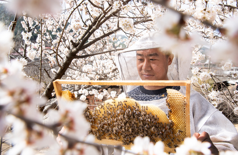 3月15日,麻坪镇云蒙山村村民程宝峰在查看蜂王产卵情况。通过县上的技术培训,程宝峰今年饲养土蜂240箱。
