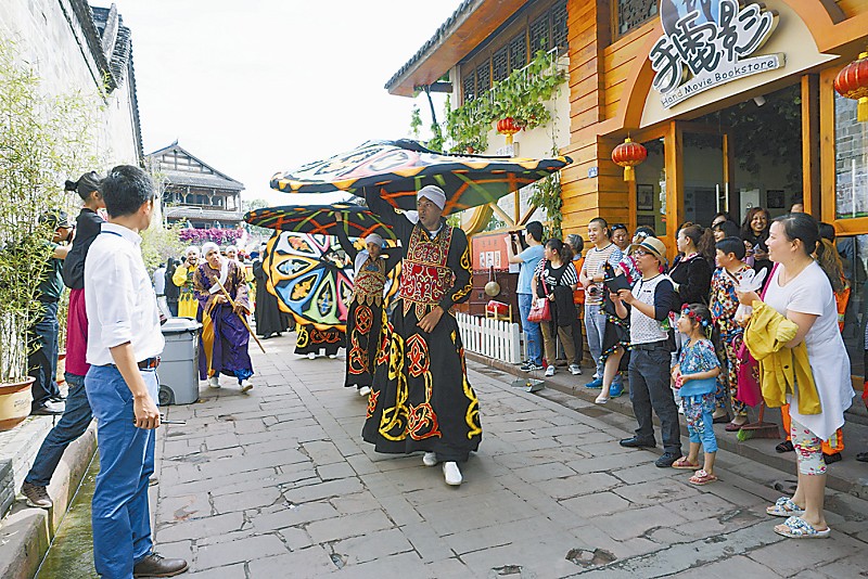 5月1日,来自埃及、俄罗斯、印度、蒙古、苏丹5个国家的艺术团,在即将开启演出首秀前,着舞台盛装,来到古镇街道上,与游客们近距离互动,一路欢歌热舞,笑声不断;中午12点半,中央民族歌舞团的经典曲目表演,拉开了洛带“集林演艺镇”多样化演出的序幕。