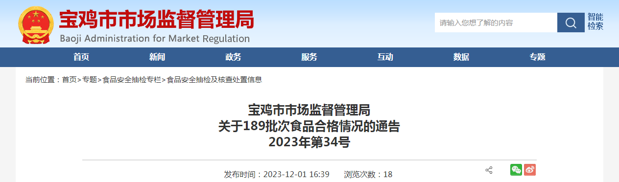 【陕西】宝鸡市市场监督管理局关于189批次食品合格情况的通告2023年第34号