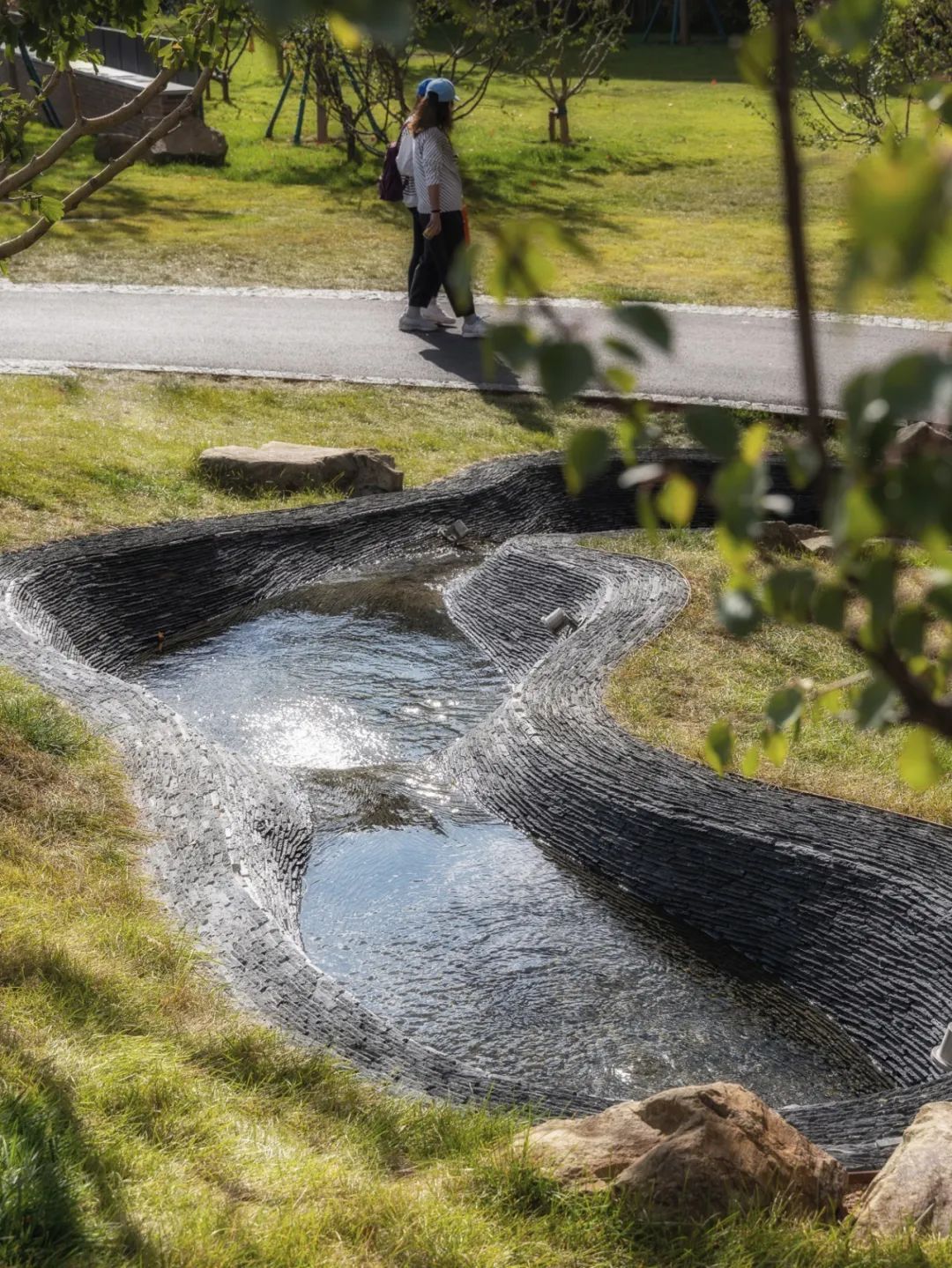 位于山境的入口,也是中心小镇的最高处。结合整个中心小镇的竖向设计和水策略,设计将山林间的溪流、置石等自然情境在此呈现,表达“小桥流水人家”的意境。在水景端头设置一处山石和涌泉,用“清泉石上流”的潺潺流水声,引人入胜,强调山林间归家的自然感受。“溪流园”池底是用片岩拼贴而成,工法细致,用流动感的肌理表达韵律和趣味。在北方寒冷漫长的冬季没有水的时候,“水落石出”也能成为一处景致。