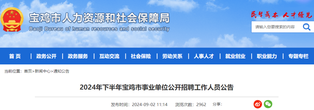 根据《事业单位人事管理条例》《陕西省事业单位公开招聘工作人员实施办法》及相关规定,2024年下半年宝鸡市事业单位面向社会统一公开招聘工作人员298名。现将有关事项公告如下: