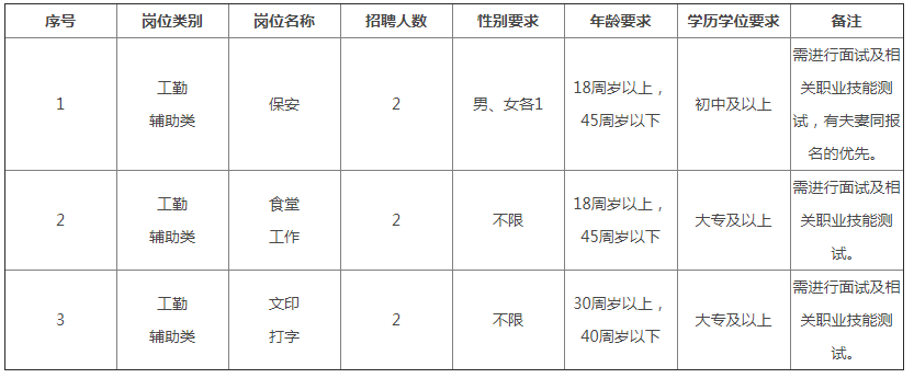 3.保安、食堂工作岗位,年龄在18周岁以上,45周岁以下(1978年3月至2005年3月期间出生);文字打印工作岗位年龄在30周岁以上,40周岁以下(1983年3月至1993年3月期间出生)。