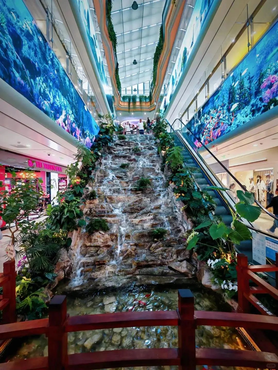 不仅有网红瀑布贯穿商场五层楼高,还可以坐上顶楼的摩天轮到达最高处,俯瞰城市的灯火阑珊。