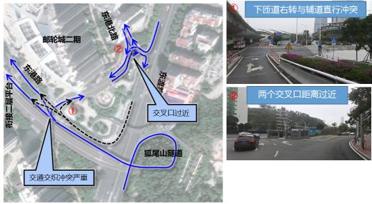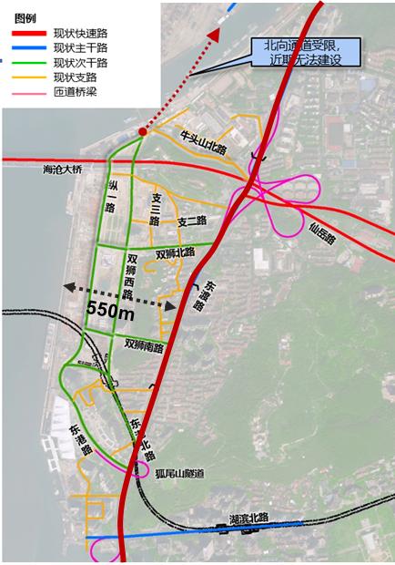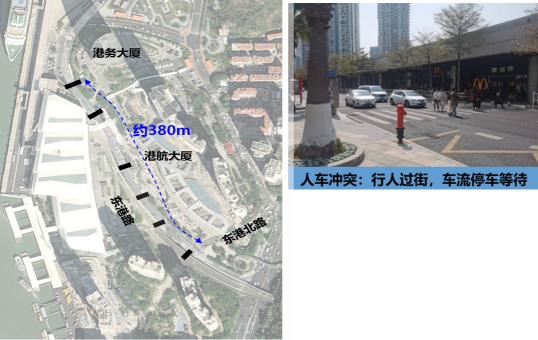 四是节点交通复杂,人车冲突矛盾突出。狐尾山隧道作为南向进入片区的主要节点,交通组织不合理、通行效率低,高峰期易形成交通瓶颈。进入片区的主要路径东港路现状设置过多斑马线,人车混行严重,影响通行效率。