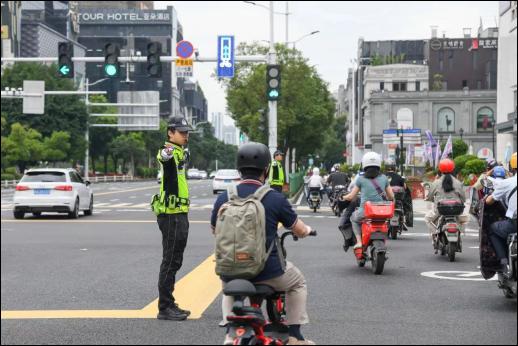 路口由1个民警带8个铁骑和N个志愿者/违法外卖员,强化通行引导和秩序管控,确保实施成效。