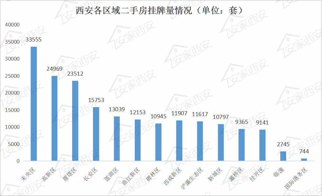 从挂牌量区域分布上来看,二手房挂牌量较大的几个区域分别是未央、高新和雁塔三个区域,三区共计7.3万余套房源供应,占总供应量的43%。