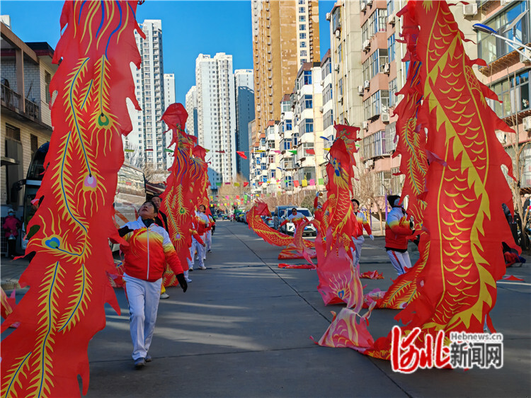活动伊始,社区大鼓队的10余名鼓手精神抖擞、激情澎湃地挥动鼓槌,震天鼓声瞬间点燃现场气氛,拉开活动序幕。紧接着,秧歌表演者挥舞红绸,扭起秧歌,红绸随着欢快鼓点上下翻飞,舞步轻盈灵动,洋溢着浓郁的生活气息。最引人注目的当数舞龙表演,随着激昂的鼓点前奏奏响,巨龙在舞龙者手中仿佛被赋予生命,时而在追逐嬉戏,时而如蛟龙出海,时而又腾飞云霄,精彩的表演将现场气氛推向高潮。