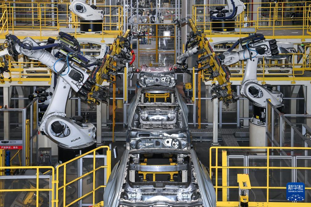 2月26日在吉利汽车宝鸡制造基地焊装厂拍摄的自动化焊接线。