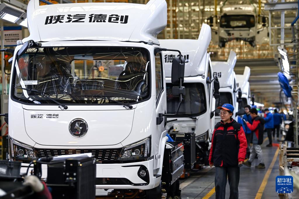 2月27日,工作人员在位于宝鸡市岐山县的陕汽集团商用车有限公司总装车间生产线上作业。