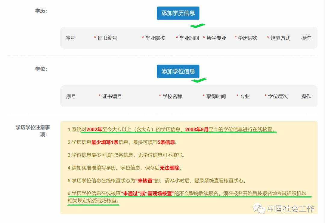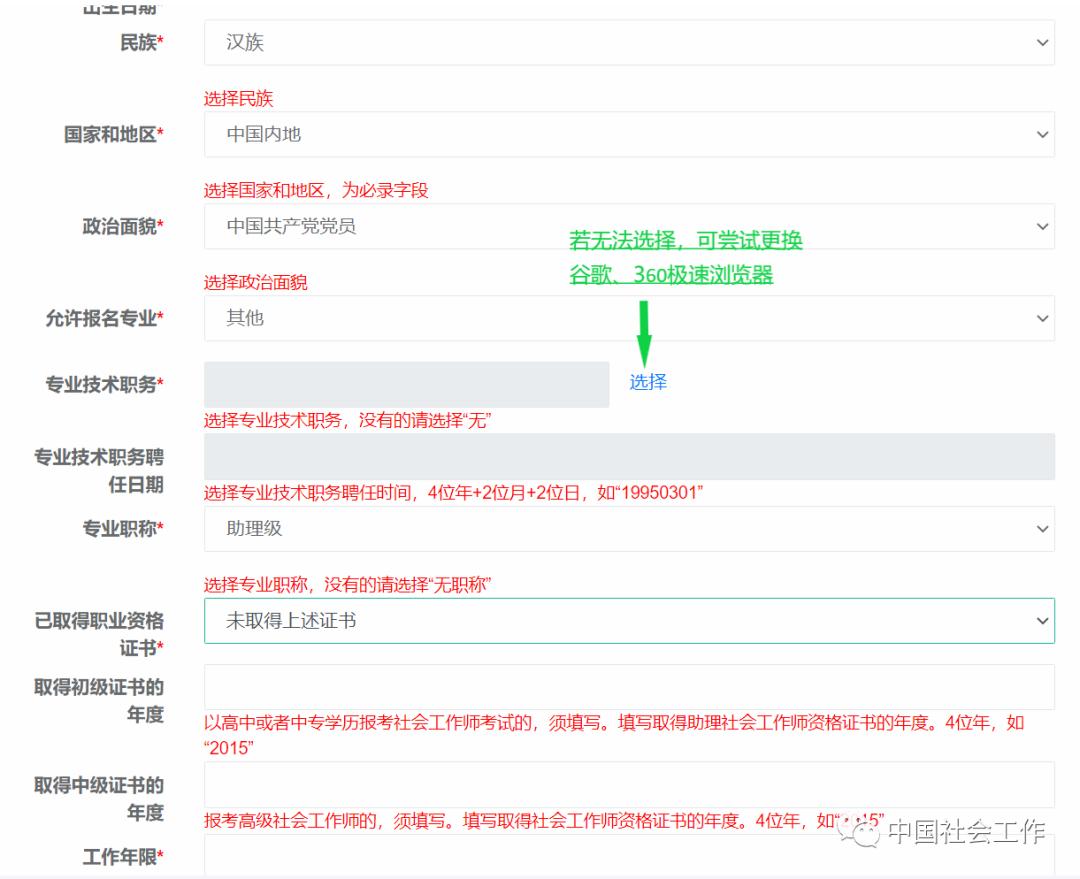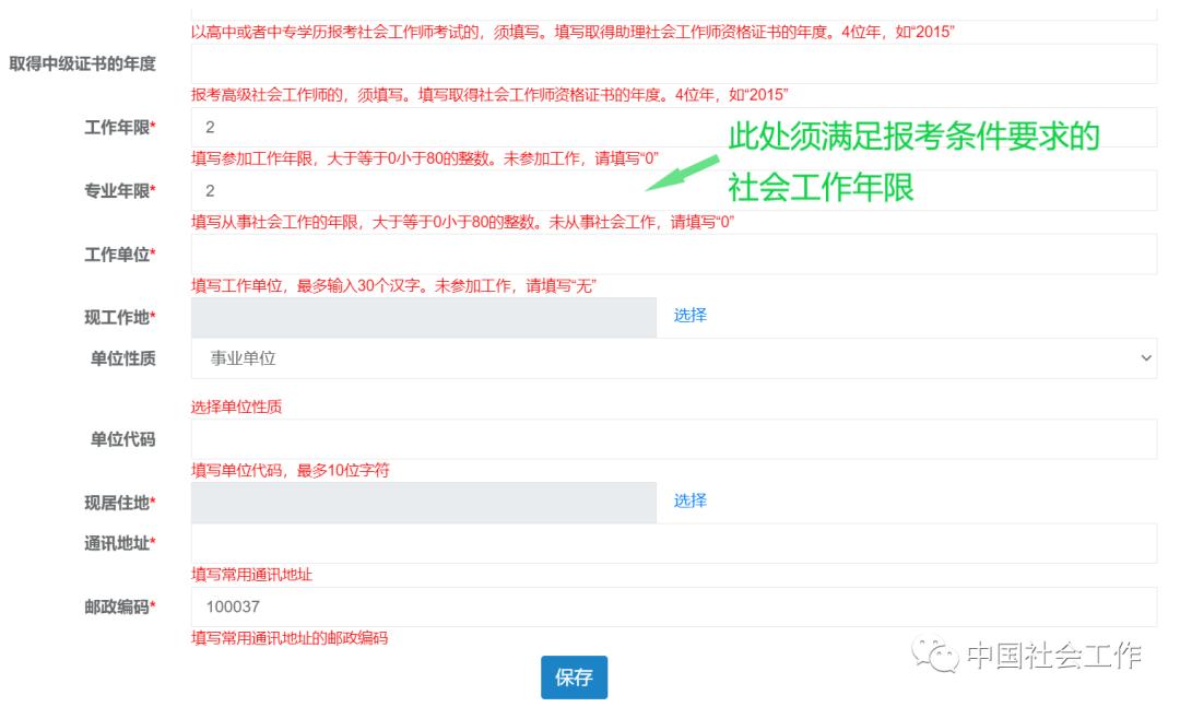 (12)工作年限必须大于等于专业年限。这里的专业年限是指从事社会工作的年限,需要符合之前选择的报考条件。如,报考条件选择“取得其他专业大专学历,从事社会工作满4年”,就必须填写不少于4年的专业年限。