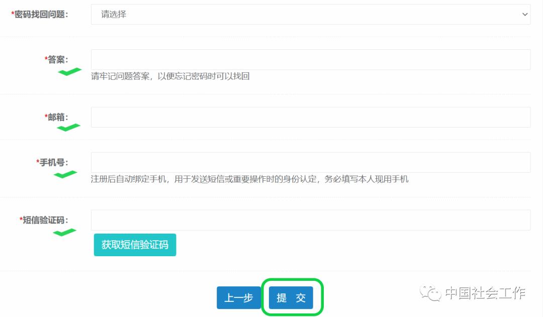 选一个熟悉的问题填写,并牢记问题答案,以便忘记密码时可以找回。信息确认无误后,点击“提交”。