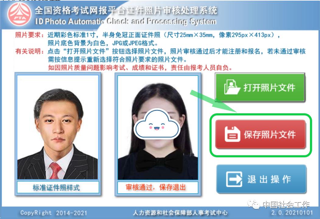 3.如果处理的照片符合要求,将自动调整裁切出标准报名照片;若不符合要求,会提示照片存在的问题。审核通过后点击“保存照片文件”,保存审核合格后的照片文件,默认文件名“报名照片.jpg”