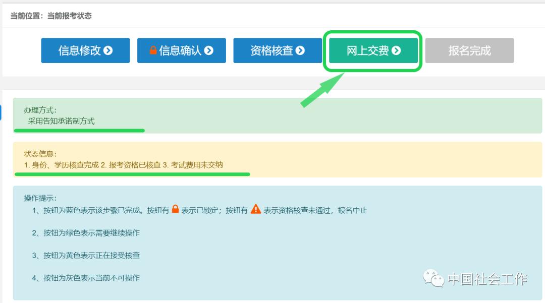 报名成功后会显示流程进度,需要在规定时间内及时缴费。学历系统验证通过的不用去现场审核,直接点击“网上交费”进入缴费;没有通过的要进行现场资格核验,只有等人工审核通过后才能缴费。缴费前可以进行报名信息修改。