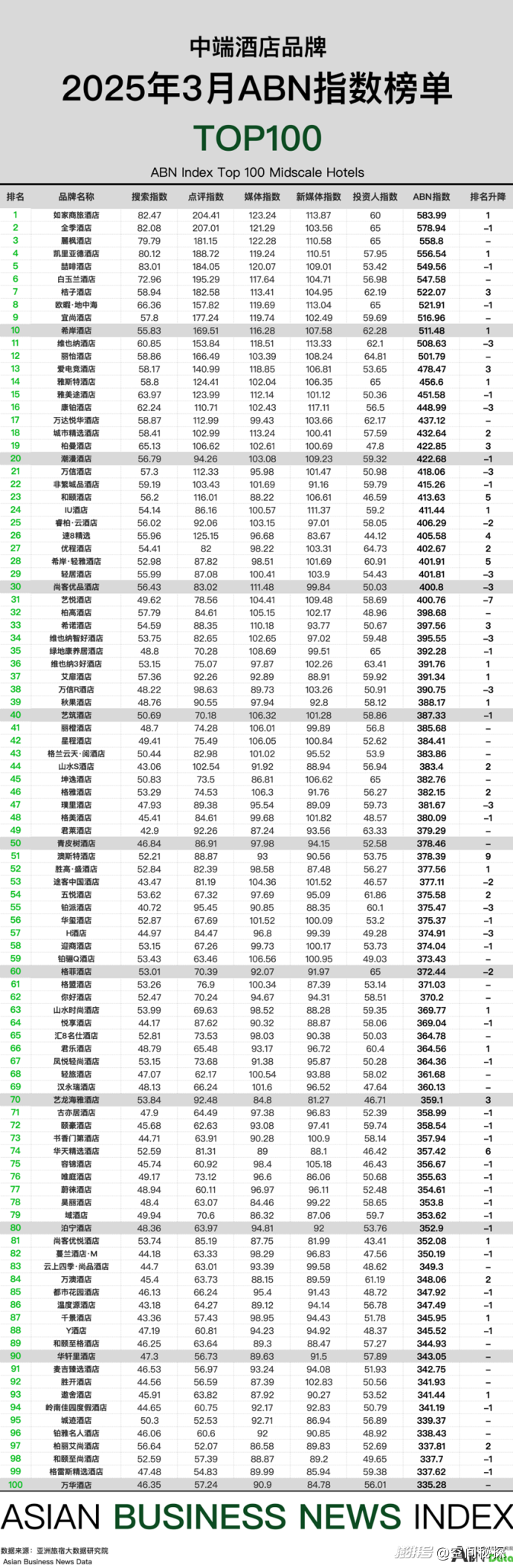 综述:2025年3月,中高端酒店的搜索、媒体和投资人指数保持高位水平,五个指数监测综合平均得分达到了404。