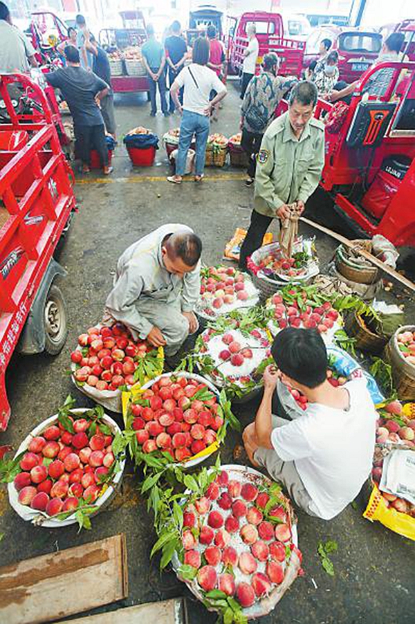 龙泉驿区洛带镇综合市场是当地知名的水蜜桃批发市场之一,每天有数万斤鲜桃源源不断地送到这里来。