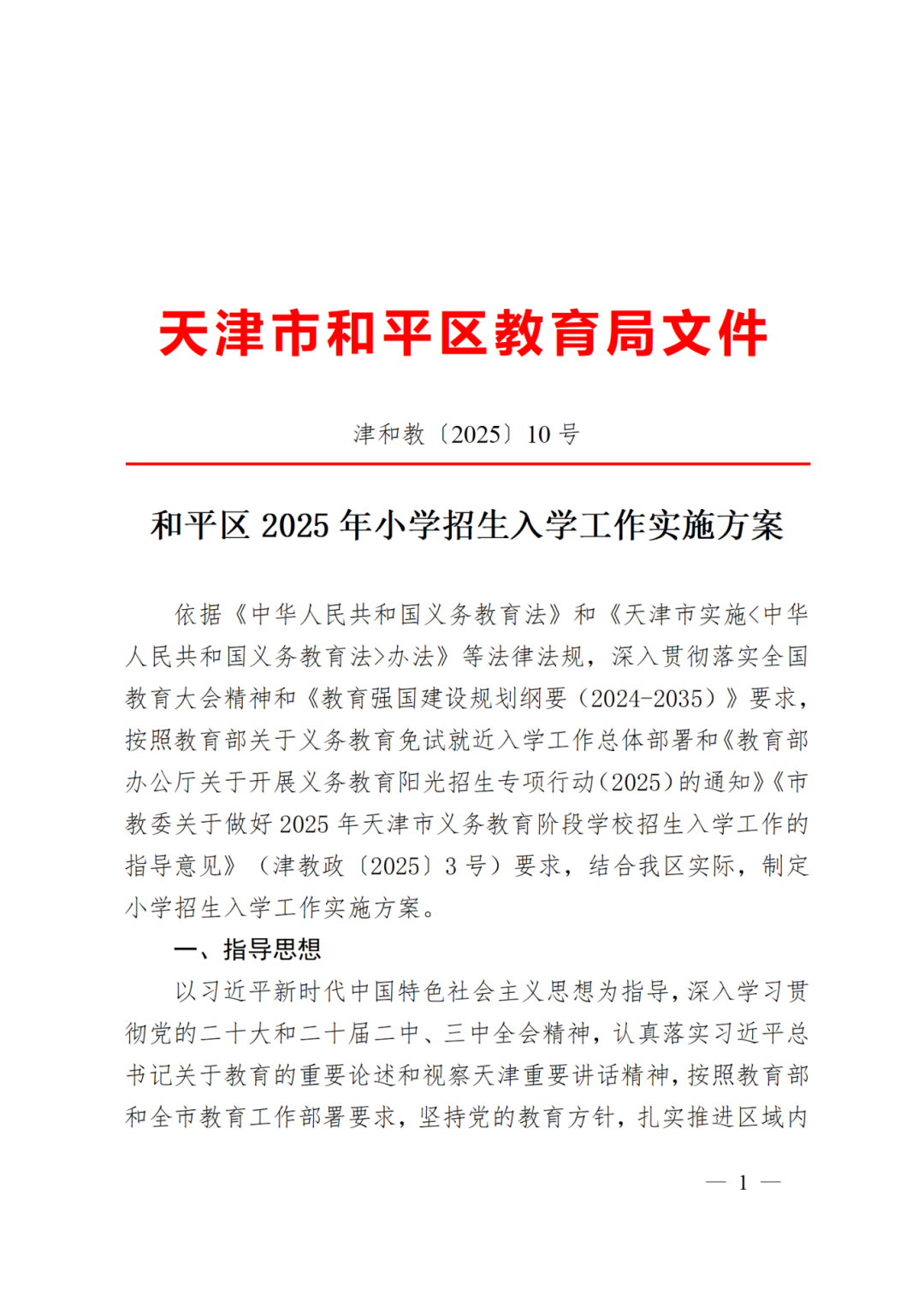 根据《中华人民共和国义务教育法》《天津市实施<中华人民共和国义务教育法>办法》等法律法规,深入贯彻落实全国教育大会精神,落实《教育强国建设规划纲要(2024-2035年)》及市委、市政府关于推进教育高质量发展有关要求,按照《市教委关于做好2025年天津市义务教育阶段学校招生入学工作的指导意见》(津教政?2025?3号)和《教育部办公厅关于开展义务教育阳光招生专项行动(2025)的通知》(教基厅函?2025?5号)要求,结合我区实际,制定本方案。