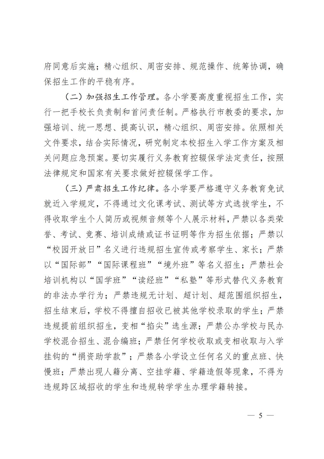 (二)依法招生,规范管理。各单位要严格执行招生入学相关政策,坚持公开、公平、公正的原则,严格审核报名材料,严禁招收择校生、跨片生,合理有序地解决好居住证持有人随迁子女入学问题。要全面落实提高义务教育质量的相关要求,开足开齐规定课程,深化课堂改革,切实提高教育教学质量。要严格落实“双减”和五项管理工作各项要求,切实减轻学生课业负担,保证学生每日休息时间。要科学做好小幼衔接工作,做好一年级新生入学适应教育,严格执行零起点教学。