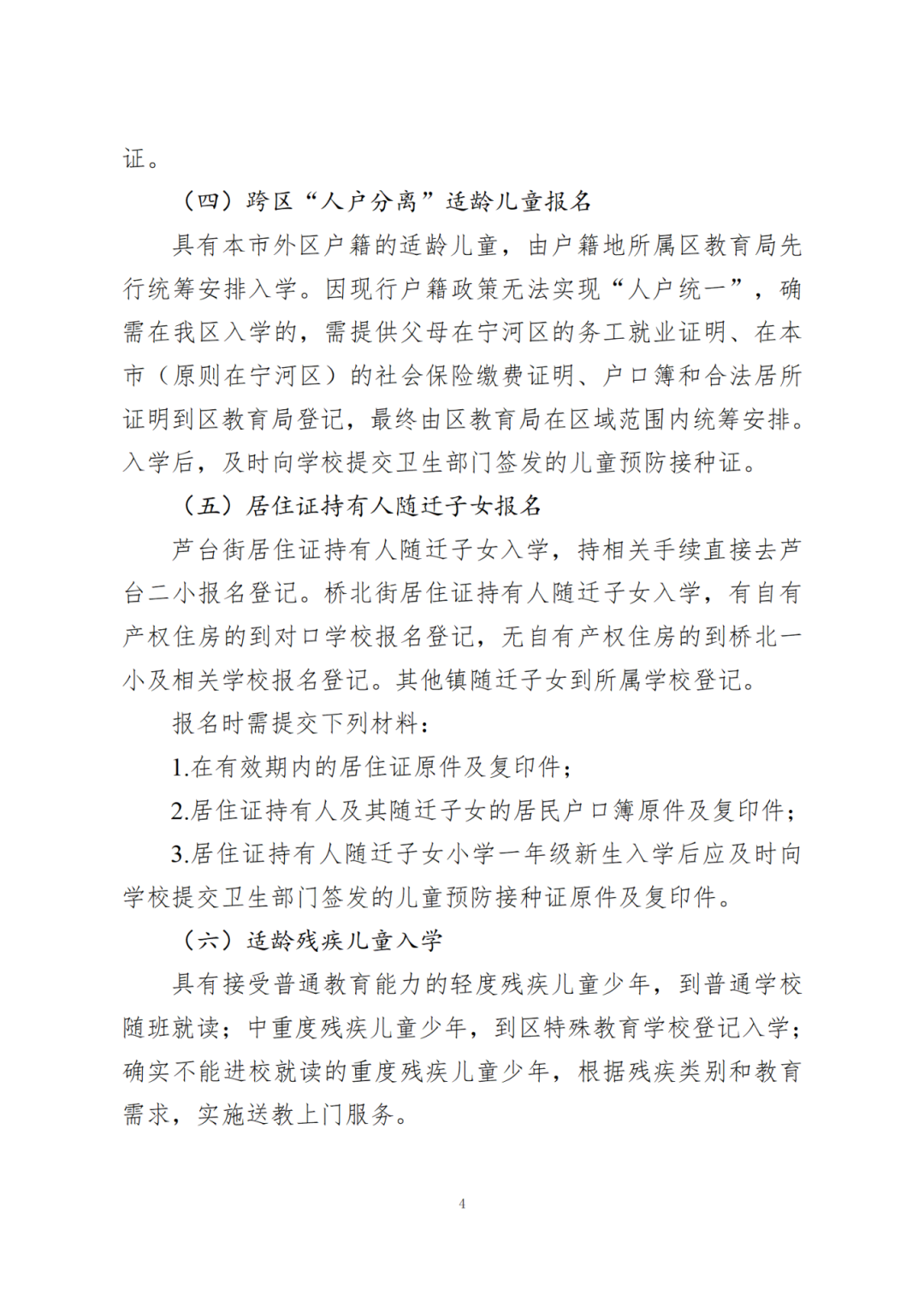 (4)在我区购房的(房屋产权人须为学生父母)外省、本市外区的“人户分离”适龄儿童,因现行户籍政策无法实现“人户统一”,确需在实际居住地入学的,到房屋居住地所属片学校登记,由教育局统筹安置在有学位的学校。本市外区户籍在我区无房户的适龄儿童,根据市教委招生文件精神,到户籍地所属区报名入学。
