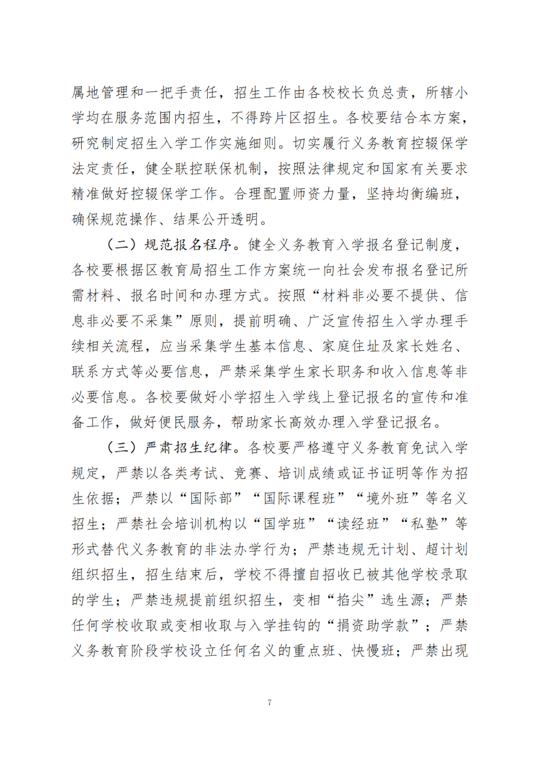 (二)坚持属地管理,结合我区实际制定各环节操作细则,区内各中小学在教育局组织下实施招生入学工作,落实国家义务教育免试就近入学要求。