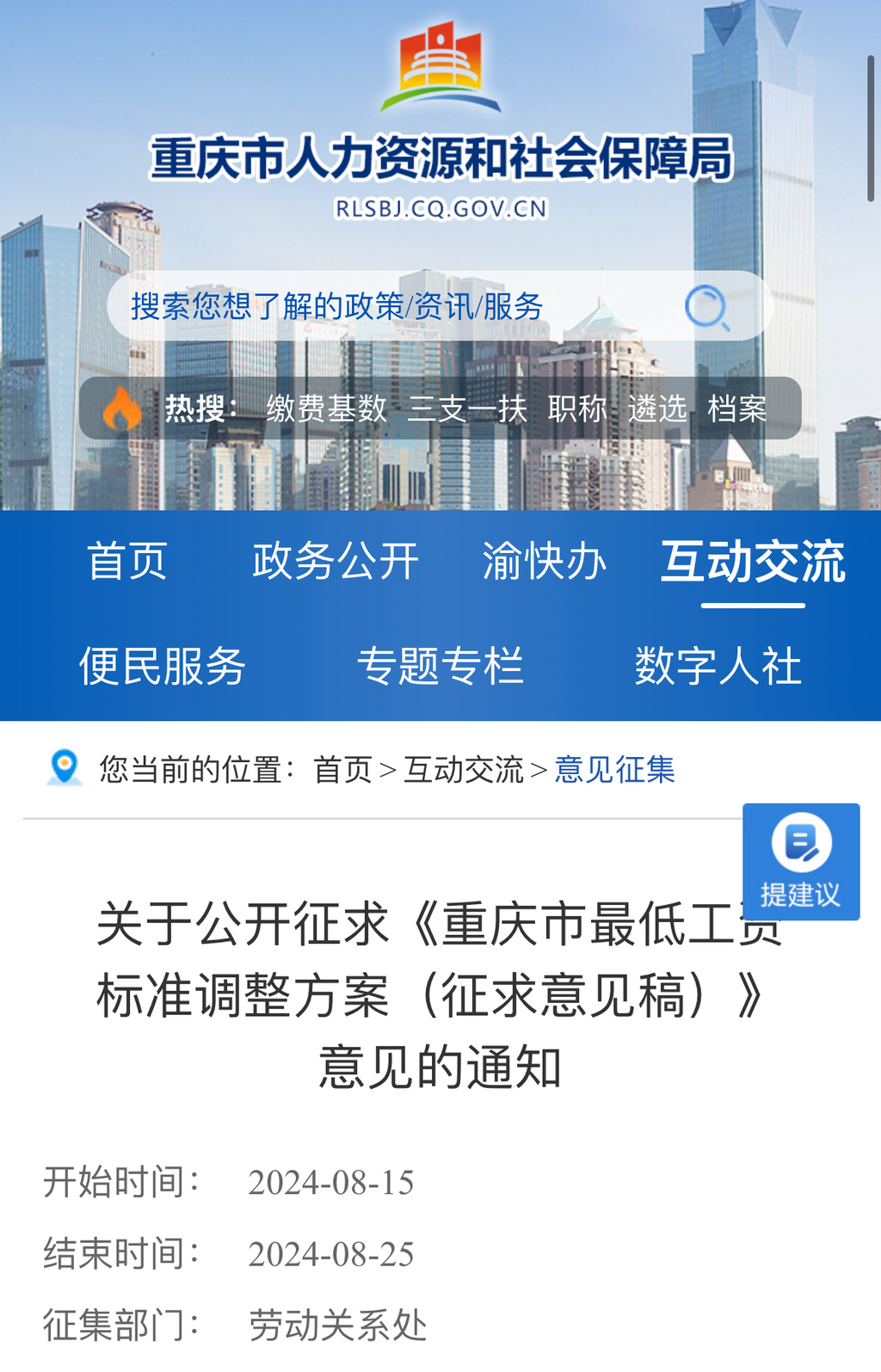 8月15日,重庆市人力社保局发布《关于公开征求〈重庆市最低工资标准调整方案(征求意见稿)〉意见的通知》(下称“通知”)。