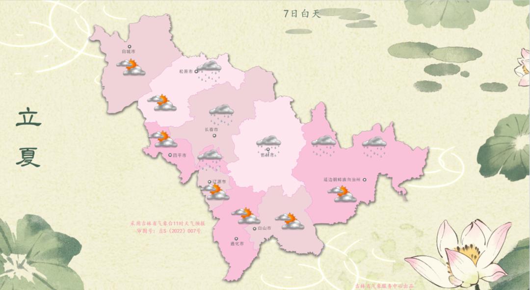 7日夜间到8日白天,全省多云,白城、松原、长春、四平、辽源、吉林、通化北部、白山西北部、延边有小雨,其中白城南部、松原北部部分地方有中雨。