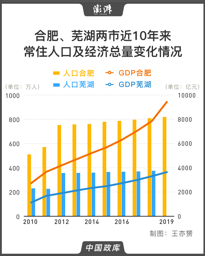 近10年来,合肥、芜湖两市GDP、常住人口差距呈现逐年扩大趋势。澎湃新闻记者 王亦赟 马作鹏 制图(注:2019年芜湖市常住人口数据暂未发布)