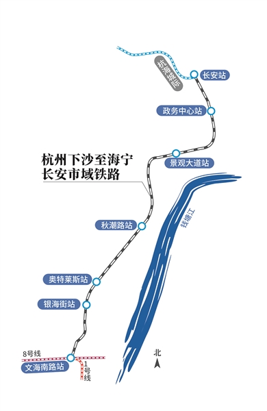 未来,海宁长安、盐仓的市民可以先坐市域铁路到达文海南路站,换乘杭州地铁1号线,去杭州市中心、城东和西湖边等地或换乘其他地铁线路。也可以换乘地铁8号线,过钱塘江到达大江东、钱塘高铁站等地。