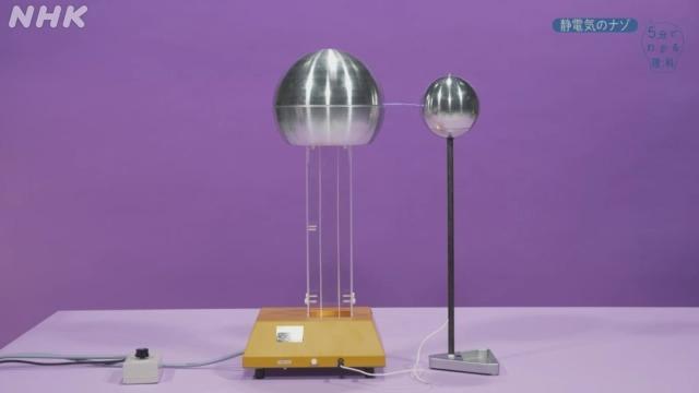 冬、ドアノブにさわろうとして、「パチッ!」とすることがあります。これも静電気(せいでんき)のしわざ。「放電(ほうでん)」といいます。放電の様子を、実験装置(じっけんそうち)を使って見てみましょう。装置の中のベルトをこすって、金属(きんぞく)の銀色の球(たま)にマイナスの静電気をためます。すぐ横に、同じような金属の球をおきます。スイッチ、オン! どうなるかな? すると、球と球のあいだに光の線が走りました。たまっていた静電気から電気が空間にとびだし、移動(いどう)します。その瞬間(しゅんかん)のエネルギーは、とても大きい!