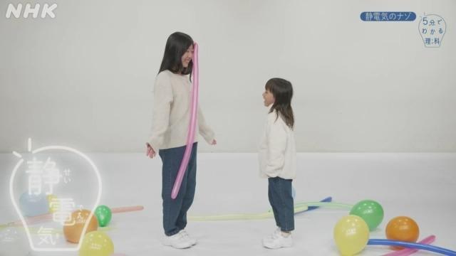 ものの中では、プラスとマイナスが電気的(てき)につりあっています。ものをこすると、マイナスの電気が一方に移動(いどう)し、プラスが多いものと、マイナスが多いものに分かれます。プラス、マイナスにかたよってとどまるのが、静電気(せいでんき)です。静電気が起きるとどうなるのでしょう。ストローを布(ぬの)でこすると、マイナスの静電気が起きます。一本を固定(こてい)し、もう一本を近づけると…。にげていきます。マイナスの静電気どうしは、しりぞけあうのです。