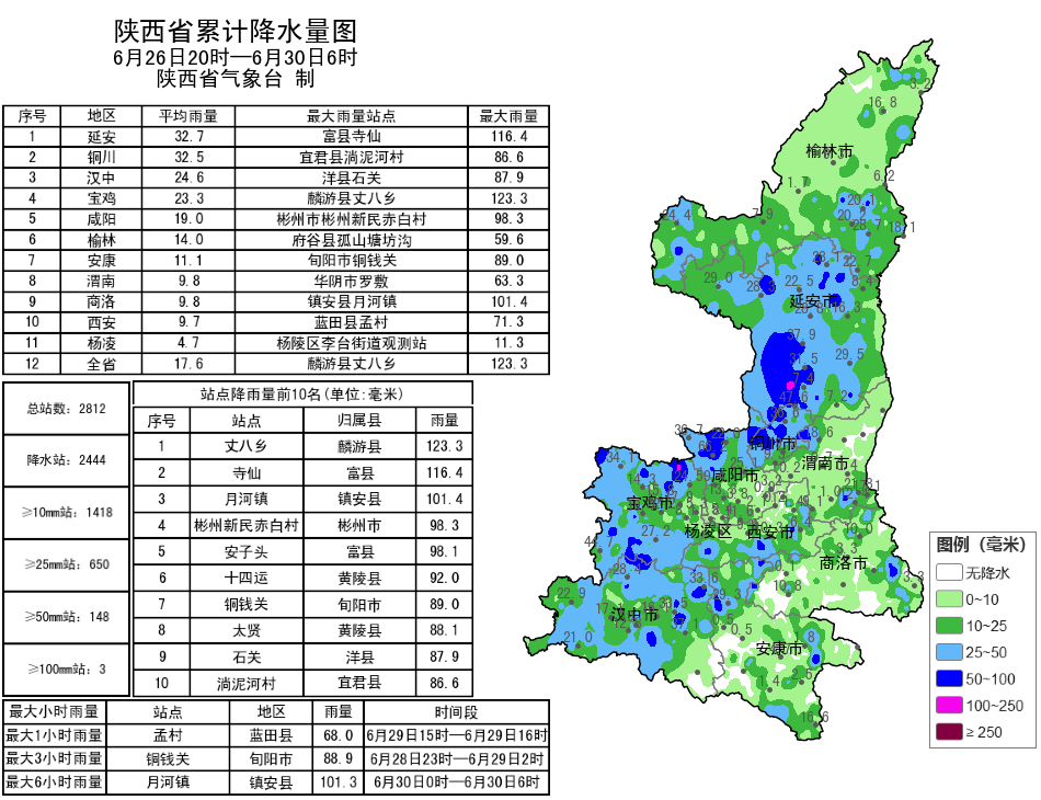 6月26日20时—30日06时全省共有111个区县2444个监测站出现降水(图1、表1),最大麟游丈八乡123.3毫米;共3站累计降水超过100毫米,148站累计降水超过50毫米,648站累计降水超过25毫米;西安城区最大28.5毫米(灞桥洪庆三阳管区)。