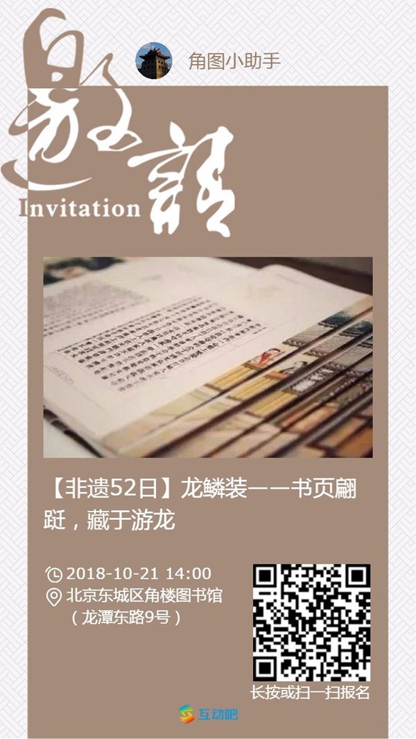 本周,龙鳞装非遗传承人张晓栋走进角图,邀您在字、纸、页的舞台上游走,体验一段书戏之旅,体味书籍艺术带来的感动与震撼。