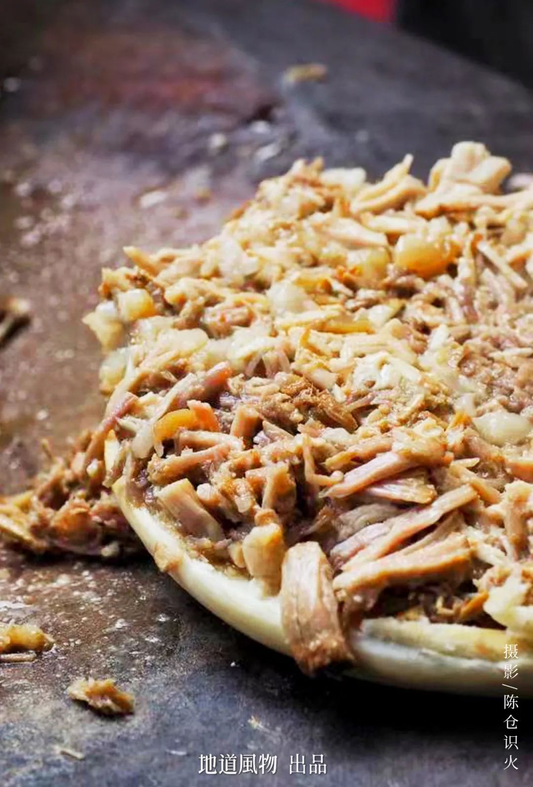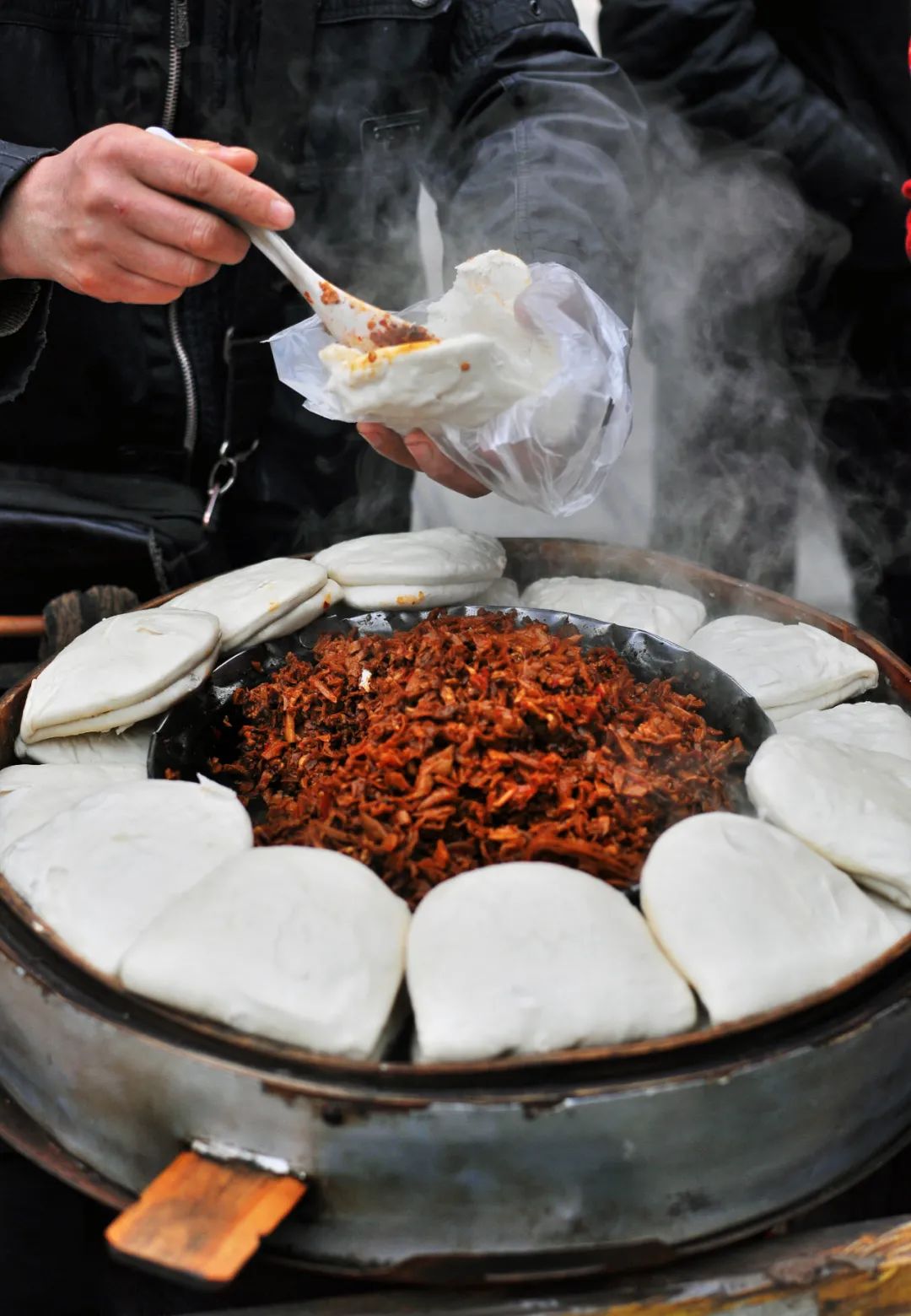 一张馍,划开两层皮,裹满汁水的肉剁碎抹进去,夹出了地道的陕西小吃——肉夹馍。
