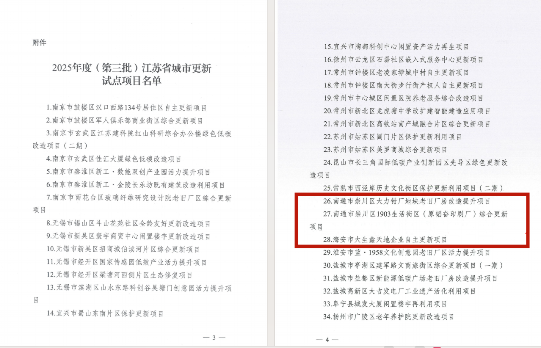 近日省住房和城乡建设厅印发2025年度(第三批)江苏省城市更新试点项目名单南通共有三个项目成功入选