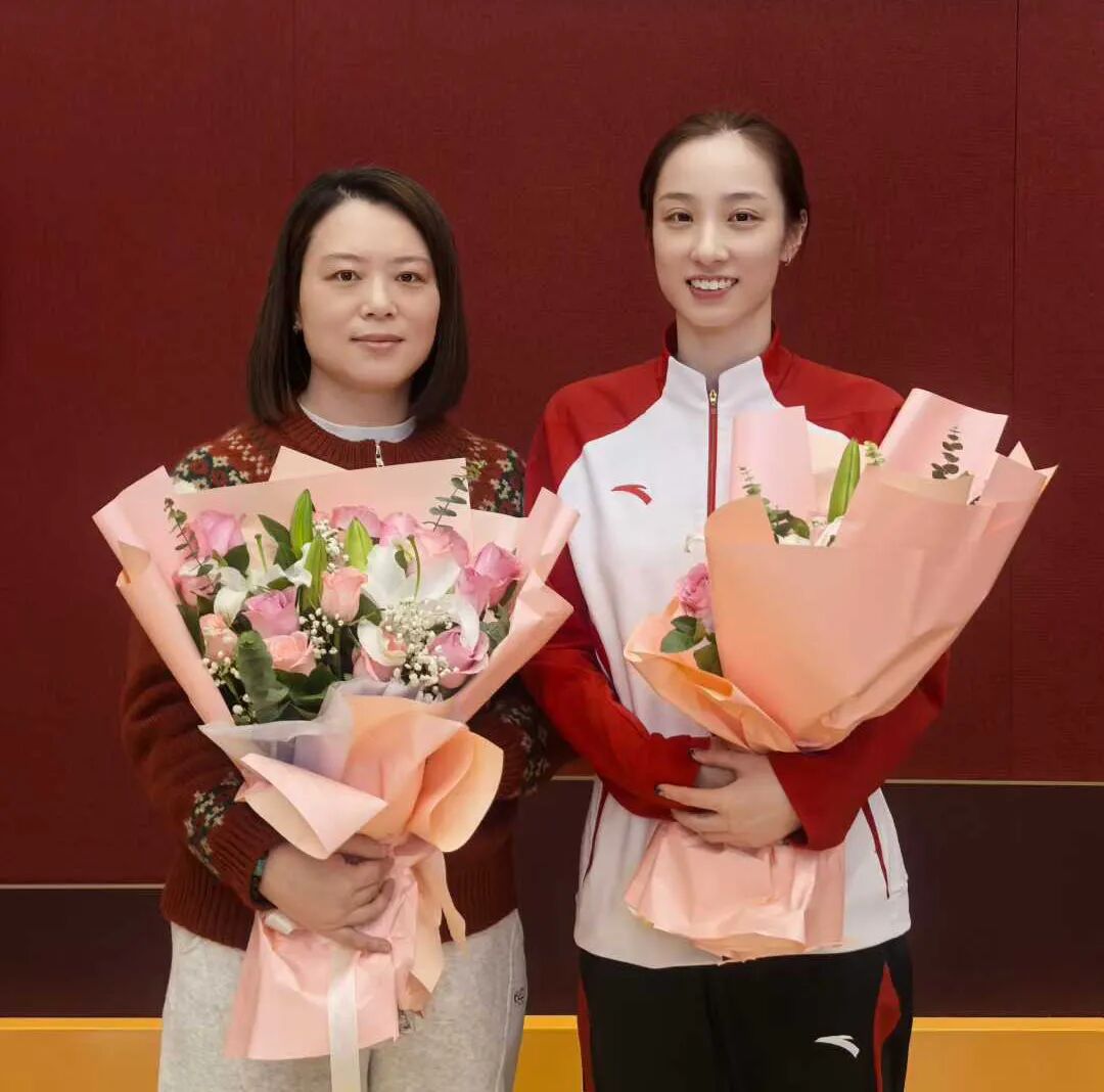 登榜现场,邱铮(右一)身着国家队领奖服,在荣誉榜前与输送教练、南通市儿童业余体校蹦床教练赵微娜合影。