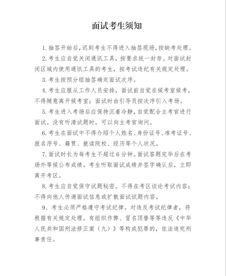 3、考生应严格遵守时间规定,面试当天上午7:30分前(下午13:30)前到达面试地点,服从工作人员管理安排。未按规定时间到达面试地点的,视为自动放弃面试资格。